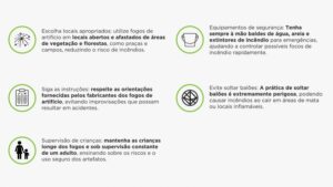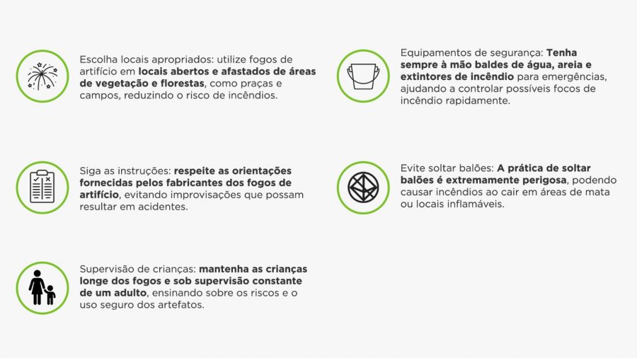 “Fagulhas podem atingir áreas de vegetação seca, iniciando focos de incêndio que podem se espalhar rapidamente, causando danos irreparáveis à flora e fauna local. Então, a orientação é respeitar as áreas naturais e manter os fogos de artifício longe desses locais”.